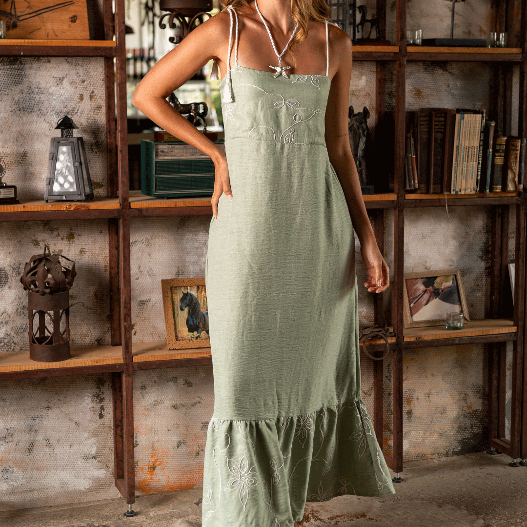 Confeccionado en una tela súper fresca, es ideal para los días cálidos y las escapadas inolvidables. Las tiras adornadas con sutiles flecos le dan un aire boho chic que fluye con cada paso.